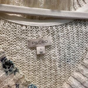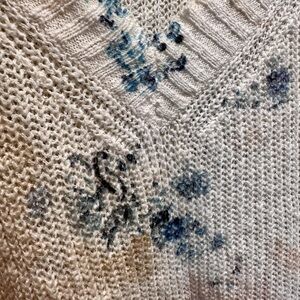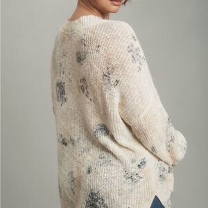 Stylish oversized v-neck sweater by Anthropologie. Cream with blue patterns. Cotton blend, lightweight knit. Perfect for casual wear.
