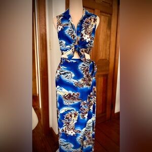 Vibrant blue sleeveless button down blouse and wrap around skirt with tropical print. Features tie-front design. Perfect for a beach day.