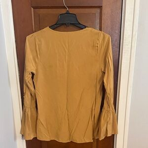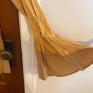 Stylish mustard blouse featuring intricate floral embroidery. Ideal for a vibrant look. Button detail and and open flowy sleeves. Tag is not attached on one side.
