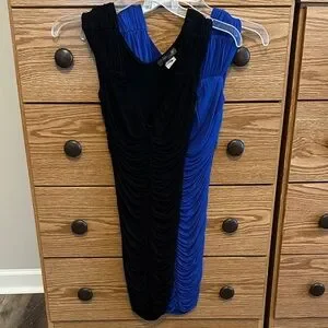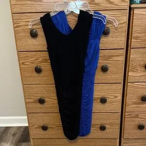 This elegant dress features a striking blue and black color combination with a flattering ruched design. Perfect for any occasion, it offers a sophisticated and stylish look.