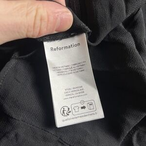 Branding and labels: Reformation woven neck label and interior care/content tags marked made in Vietnam with Climate Neutral Certified text.