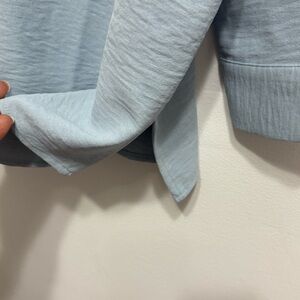Hilary Radley dusty blue utility-style blouse in size Large. Features full button front, collared neckline, two chest flap pockets, and long sleeves with roll tab detail.