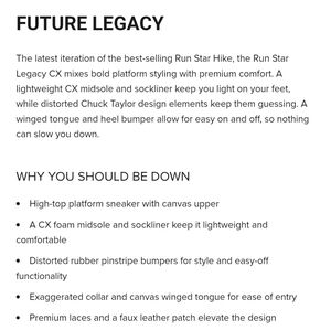 Step into these awesome Unisex Run Star Legacy CX High tops in black. Size 6.5 Men/8 Women. Brand new in box.
