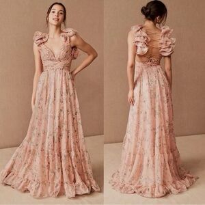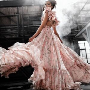 Mac Duggal pink floral gown, size 2 — a true showstopper designed for moments that matter. Crafted from flowy sheer tulle with layered floral detailing, this dress features: