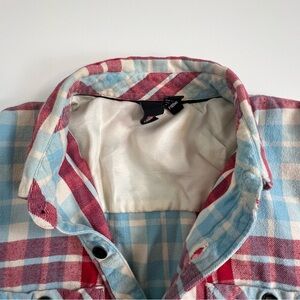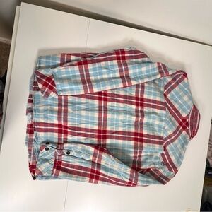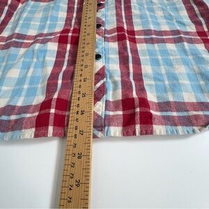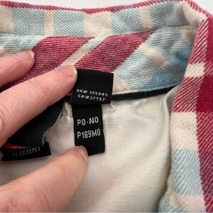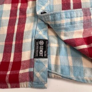 pre-owned men's Element flannel shirt. This classic piece features a vibrant red, white, and light blue plaid pattern, perfect for a casual look or layering.
