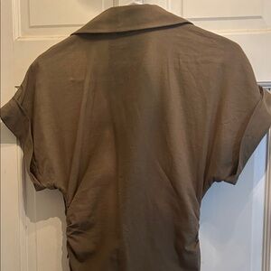 Discover elegance with this Zara chic olive button-down dress. Perfect for any occasion, it features a flattering fit and stylish design. It has cinched sides, which helped to flatter your waist line. It is very lightweight and versatile.