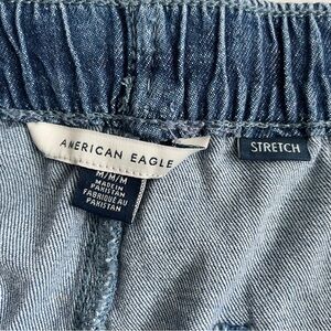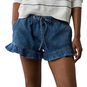American Eagle Stretch Ruffle Denim Shorts Description Stretch Denim American Eagle Ruffle Shorts with Adjustable Drawstring in Women' Medium - A fun, frilly short for a femme vibe. Perfect for all your summer adventures! - Drawstring waist - Side seam pockets - Ruffle hem - Style: 4331-8303 Color: 947 - 60% Cotton/14% TENCEL™ Lyocell/ 14% Linen/10% Recycled Cotton/2% Elastane - Machine wash Size M Approx lay flat measurements Waist 16” with cinch tie Front rise 11” Inseam 3” Style tags: ruffle, denim, feminine, cottagecore, granola girl, soft girl, beach, resort, cruise, frill Pre-owned and in great condition 😊