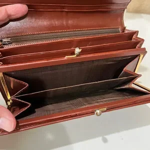 Vintage authentic. Darkened leather. Signs of age and use. Faded hardwares on the kiss-lock coin pocket. Small rips on both back sides due to use.