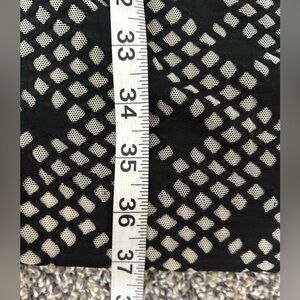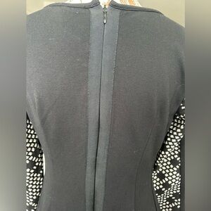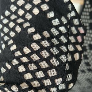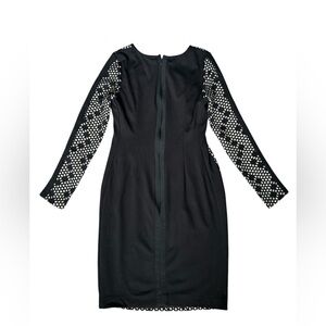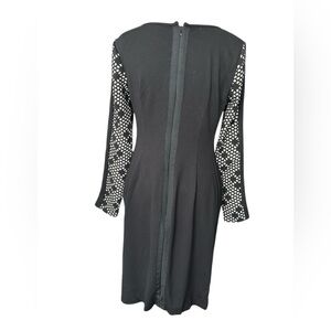 Step out in style with this elegant black knee length dress with unique square mesh covered cutout design throughout. The mesh is see through on the sleeves. Body of the dress is beautifully lined. Zipper up the back with ribbon that runs down the center. Perfect for any occasion, this dress offers a chic and timeless look.