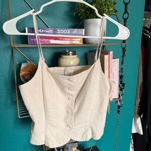 Stylish cream button-up top with a chic design. Perfect with a high waisted skirt for that fairy look, with tailored pants and ballet flats for a coquette outfit or for layering under a jacket with high waisted pants for a business casual look.