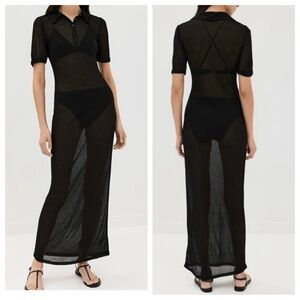 Chic black sheer dress with short sleeves. Features a button-up collar. Ideal for layering.