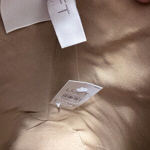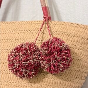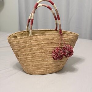 LOFT Woven Tan Tote with Red and Cream Pom Pom Accents
