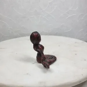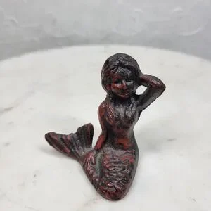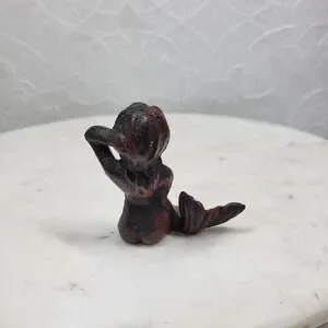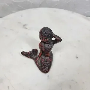 This charming vintage mermaid figurine features a seated mermaid with flowing hair and detailed textured scales. Finished in a distressed black with red undertones, she has a moody, antique-style patina that gives strong nautical and coastal décor vibes.