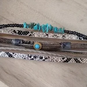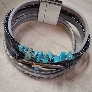 Elevate your style with this stunning turquoise like and silver tone multi-layer bracelet. Perfect for any occasion.