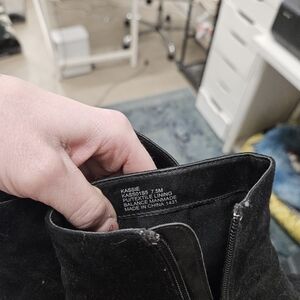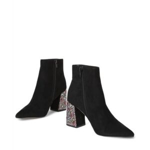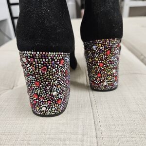 Faux suede pointy toe ankle boots with the heels covered in circle and heart shaped, multi color rhinestones. Much more sparkly in person 😍 Some scuffing around toebox near the ball of your foot on the inner sides of the boot.