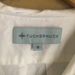 Effortlessly chic, Tuckernuck's Delfina dress is an updated take on the classic shirt dress. This style features a white cotton shirt, front breast pocket, and button-down front placket with tan piping details. Stand collar. Button tab details at waist. Cuffed sleeves with buttons at cuffs. Skirt ends above the knee and has side pockets. Unlined. Top: 97% cotton/3% spandex. Skirt: 95% polyester/5% spandex. Dry clean. Small mark on interior of collar (this is not visible when the dress is on), exterior of dress in excellent condition with no flaws or wear.
