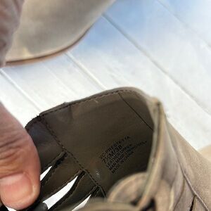 Crafted in a soft suede-like material, these Vince Camuto ankle booties in gray offer a chic and versatile style. The decorative black lacing detail adds a unique touch, while the low stacked wooden heel provides comfort and a casual flair. With a slightly rounded toe and wide ankle opening, these booties are both stylish and easy to wear. Offers are Welcome