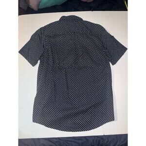 Features a navy blue base with subtle geometric micro print pattern. Button-down collar with full front button closure. Lightweight woven fabric designed for easy care and easy wear.