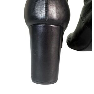 Chic black leather ankle boots with a substantial block heel. These boots offer a sleek silhouette and a comfortable fit, perfect for elevating any outfit. The distinctive design makes them a versatile choice for transitioning from day to night. Ideal for a sophisticated work ensemble, a stylish evening out, or adding a touch of polish to a casual weekend look.