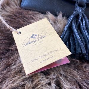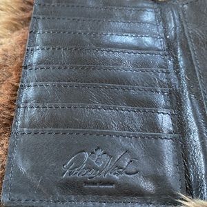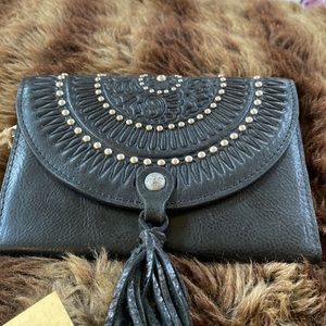 Elegant black leather wallet. Features intricate studded design. Includes stylish tassel accent.