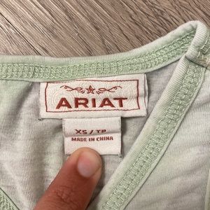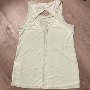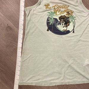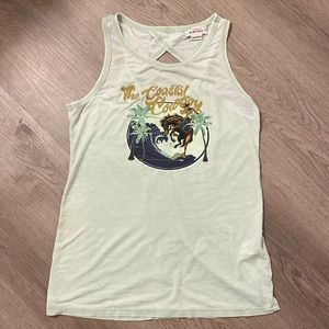 In like new condition, worn maybe once. This is a mint green colored graphic tank with a cutout on the back. The front features a coastal/beachy cowboy/cowgirl graphic with palm trees and ocean waves. It’s a lightweight, versatile top that would be great for a variety of uses.
