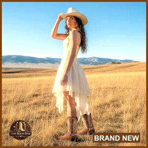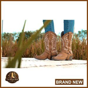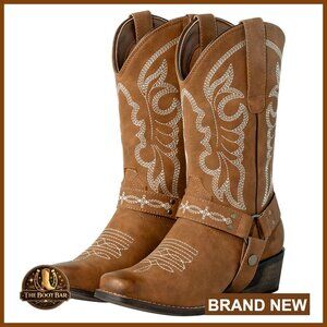 A versatile western boot featuring a removable buckle strap for two distinct looks. Designed with a roomy mid-calf, soft insole, and breathable lining for all-day comfort from rodeos to music festivals.