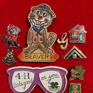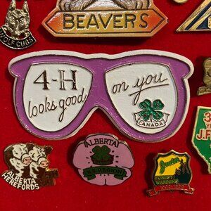 Huge Lot of vintage souvenir hat lapel pins for 4-H Jr Forest Warden Girl Guides Beavers Cubs Teddy Bear Southport Lake Louise Amoco CESO Alta Agriculture