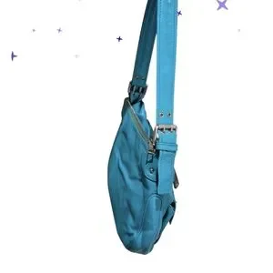 Stylish blue shoulder bag with dual front pockets. Perfect for everyday use. please view all pictures handbag has been dyed in a lovely teal color, has missing piping on edge on back part