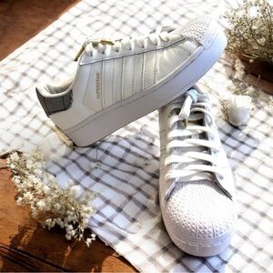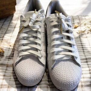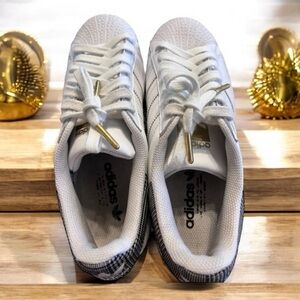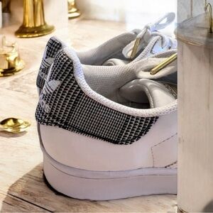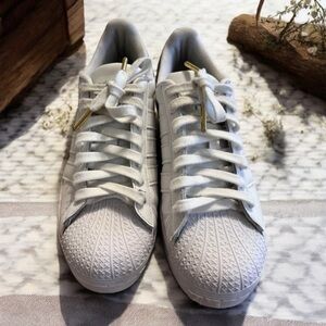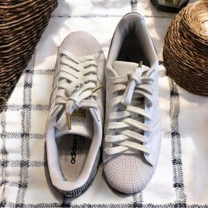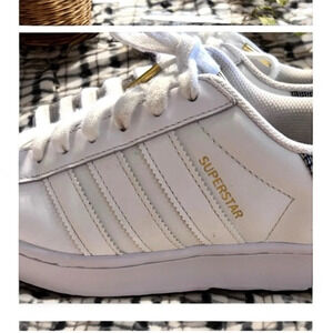 Chic white sneakers featuring gold and black accents. Perfect for casual wear. Adidas Superstar Platform Kicks Awesome condition! Gold tipped laces Women SZ 7. Super comfortable. RARE Houndstooth design!! Leather. Classic superstar adidas look. Just the best!