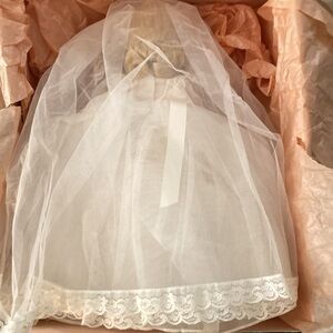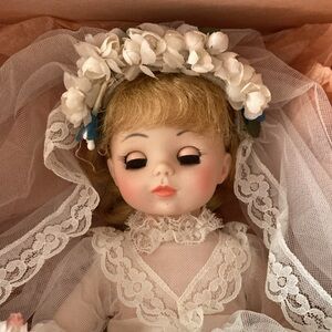 Vintage Madame Alexander bride doll #1570 from the 1970’s. Features a delicate veil and floral headpiece, along with her petticoat & a blue garter. She has blonde hair & blue eyes and stands approximately 13” tall. I have been advised that she is an Elise doll with a Nancy Drew face. I am the original owner. She is in excellent condition as she has never been displayed and has lived in her original box on a bedroom closet shelf. The box does show some age. Would be a wonderful gift for your favorite doll collector or future bride.
