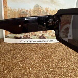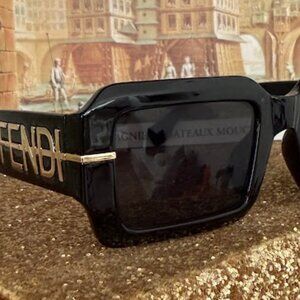 Bold oversized square sunglasses featuring a glossy black frame and dark tinted lenses. Wide temples with large gold-tone logo accent detail create a strong luxury-inspired fashion look. Thick structured silhouette with high-impact styling.