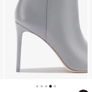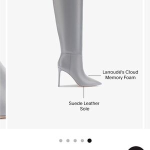 Elevate your style with Larroude's gray heeled boots, featuring a sleek knee-high design and a chic stiletto heel. Crafted from a soft material, these boots offer a form-fitting silhouette with a pointed toe for a sophisticated look. Perfect for formal occasions, they provide both elegance and comfort.