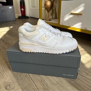 Classic New Balance 550 sneakers. Cream and white design. Ideal for everyday style.
