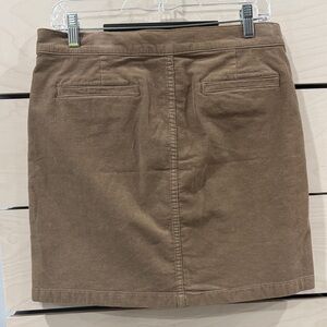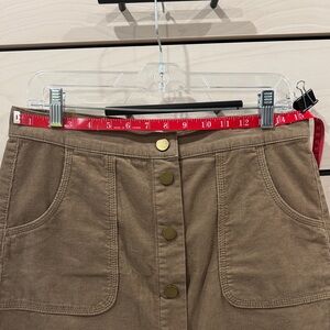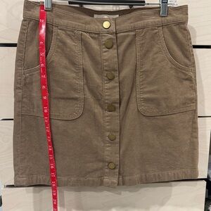 Chic tan corduroy mini skirt with button-front design. Features front pockets for convenience. Ideal for casual outings.