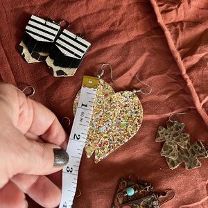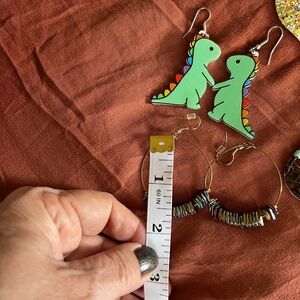 Set of unique, colorful earrings. Includes dinosaur, geometric, and abstract designs. Perfect for adding a playful touch to any outfit.