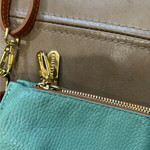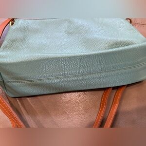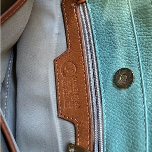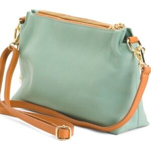 Chic Valentina crossbody bag in mint green. Pebbled leather with a stylish tan strap. Perfect for versatile wear.