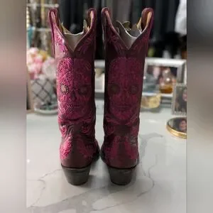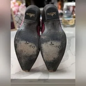 These are true beauties! Embroidery fuschia pink and maroon on a back drop of maroon leather. A snip toe makes them super comfy. A few stud details too. Worn a few times only.