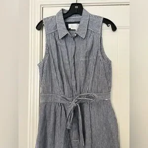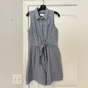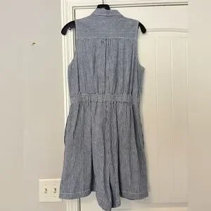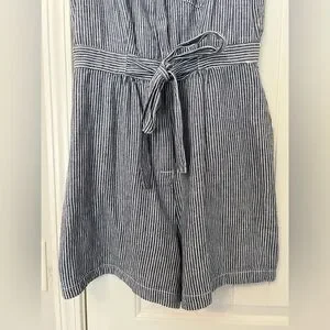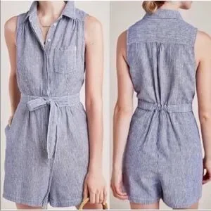 Anthropologie Blue White Striped Linen Blend Belted Romper