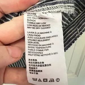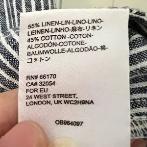 FEATURES: elastic waist with tie front; hidden button bust with zip and hook and eye closure near waist; collared; chest pocket; linen blend; seersucker striped;