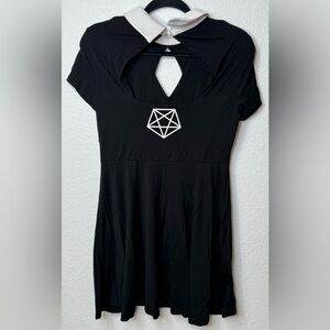 Chic asymmetrical dress by Killstar. Features a unique geometric design. Black with white collar detail.