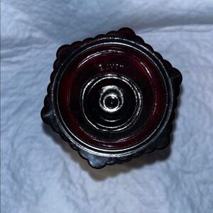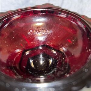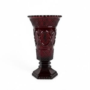 Chic Avon vase in deep red glass. Ideal for floral displays or as a decorative piece.