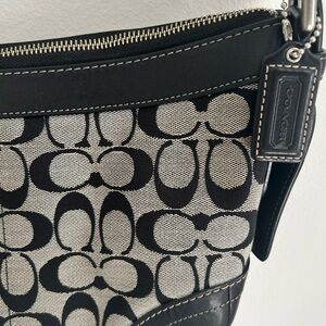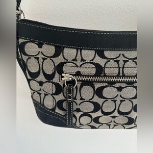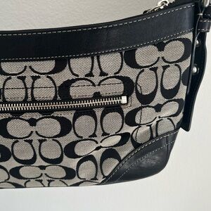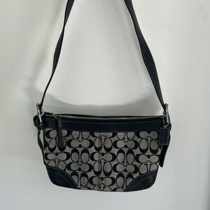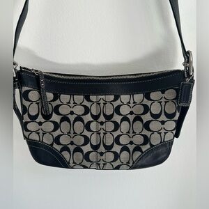 Coach F05S-1452 signature soho hobo shoulder bag with signature monogram print and black leather trim. 12”x7”x3”. Very clean and well kept for a 2005 coach purse.