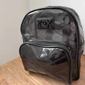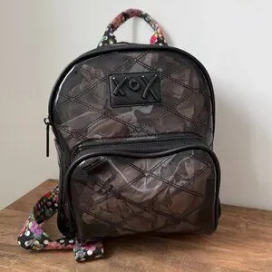 Stylish and unique Betsey Johnson clear black backpack featuring quilted transparent panels and a bold XOX detail on the front. This eye-catching bag includes colorful floral straps that add a fun, playful touch. Perfect for festivals, travel, stadium events, or everyday use when you want a trendy statement piece.