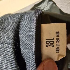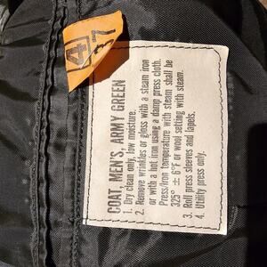 This jacket features four front flap pockets, epaulets, full lining, and a structured silhouette. Tag reads “Coat, Men’s, Army Green.” Fabric feels like wool blend. Excellent vintage condition with VERY LITTLE TO NO wear and no known flaws.