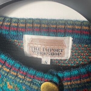 Beautiful abstract paisley knit in teal, red, mustard and deep green tones with statement gold buttons.
