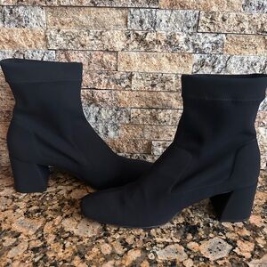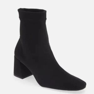 A squared-off toe and sculptural heel frame this versatile pull-on bootie featuring a stretchy water-resistant upper with a socklike fit.