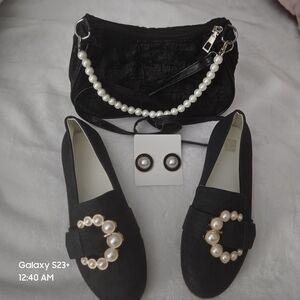 Elegant Black Loafers with Pearl Detail, Matching Purse And Earrings, Never Worn