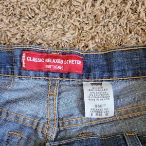 The product is a women's size 6 pair of Levi's 550 jeans in a relaxed fit with a tapered leg design. They are medium wash denim and made of cotton fabric. The jeans feature the iconic Levi's brand and are in a classic blue color. Perfect for a comfortable and stylish look for everyday wear.
