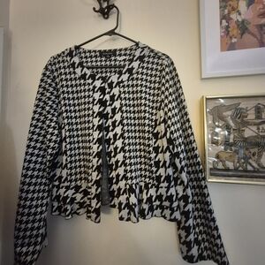 Elevate your wardrobe with this chic black and white houndstooth blazer. Perfect for any occasion, this blazer offers a timeless style and a comfortable fit, with clasp buttons. From a non-smoking home.