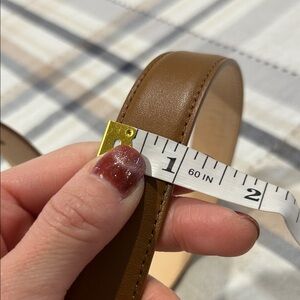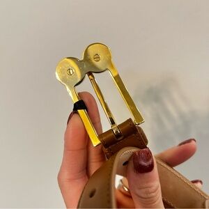 Luxurious brown leather belt with iconic gold Medusa buckle. Adds elegance to any ensemble. The width is one inch in size 85 in women.